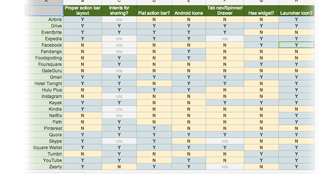 Some Android apps feel like crude, literal ports of their iOS 6 counterparts. Others feel tailored to the platform. The apps in the latter category are those that change their app to fit within Android’s mold. This spreadsheet compares a few dozen popular apps that support both iOS and Android on how well they conform to the Android-specific traits below.